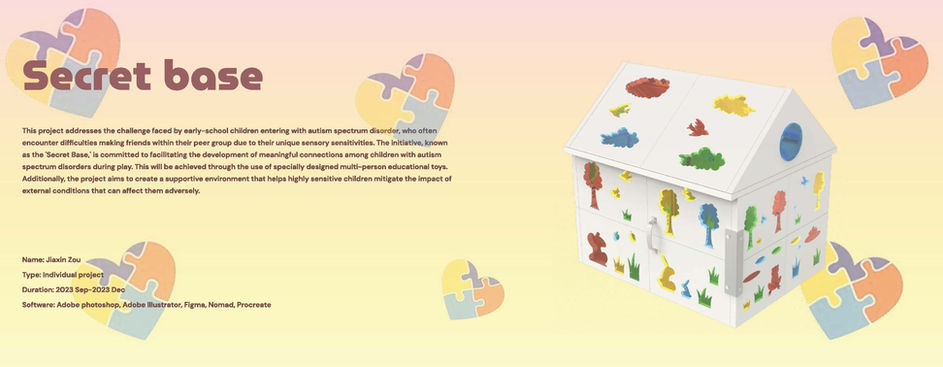 Secret base is a toy design for ASD(Autism Spectrum Disorder) kids around 5-7 years old, this toy aims to help ASD children build friendship with other kids.